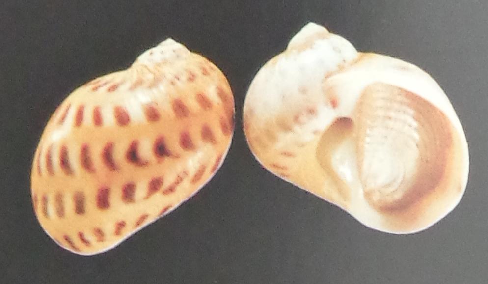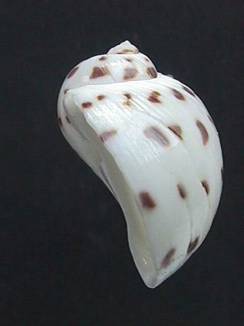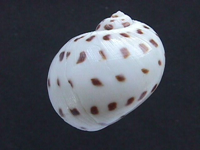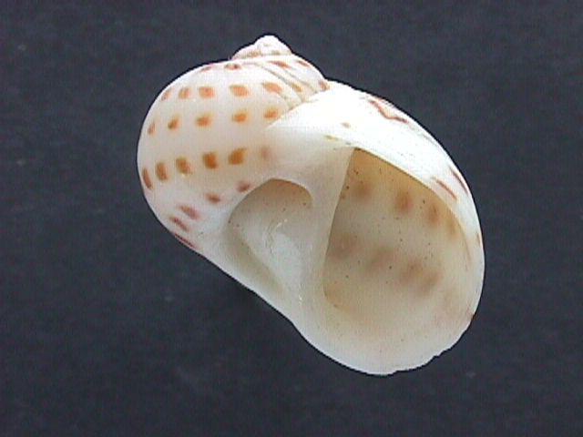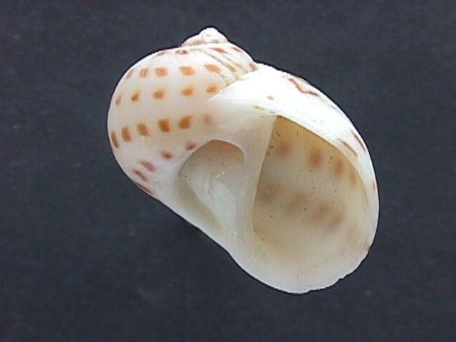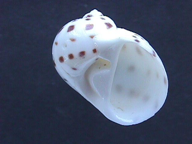 Shell rather thick, white with usually 5 spiral rows of evenly spaced dark brown spots. Parietal callus small. Funicle prominent, narrowing umbilicus as a spiral groove with deep pit posteriorly. Operculum with 6-8 grooves. Kii Peninsula and southward to tropical Indo-West Pacific, fine sand bottom in subtidal zone to 20m deep.