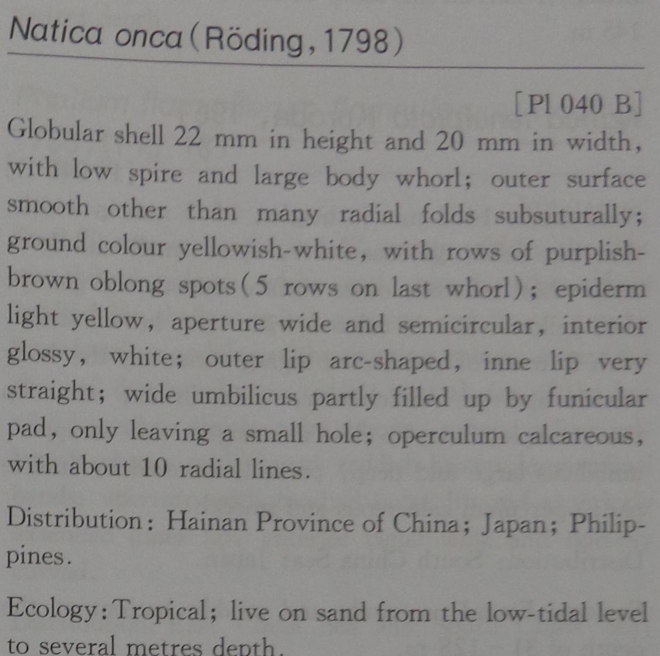 Naticidae: Natica onca (Röding, 1798) In Chung-yen, Tsi, 2004 Seashells of China.